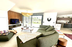 Venez vite découvrir cette surprenante villa couleur " Blanc de la Côte", au style épuré d'inspiration Grecque d'environ 114 m². Ses lignes horizontales accentuent la modernité d'une construction avec toits plats et offre un prolongement intéressant de l'architecture qui permet de profiter de 108 m² de terrasses autour de la villa. Dès l'entrée, l'accueil est chaleureux grâce au choix du carrelage en pierre de Sardaigne qui unifie la pièce à vivre et se prolonge sur l'extérieur, ce qui favorise un effet INDOOR-OUTDOOR immédiat grâce aux larges baies vitrées à galandage... Notre regard est attiré immédiatement sur une cheminée électrique XXL mise en valeur grâce à la Claire-voie en Noyer en arrière-plan qui offre un rappel élégant à la somptueuse cuisine également en NOYER : Entourée de panneaux muraux et plan de travail effet CALACATA ORO, nous avons l'impression d'être de vrais chefs étoilés....